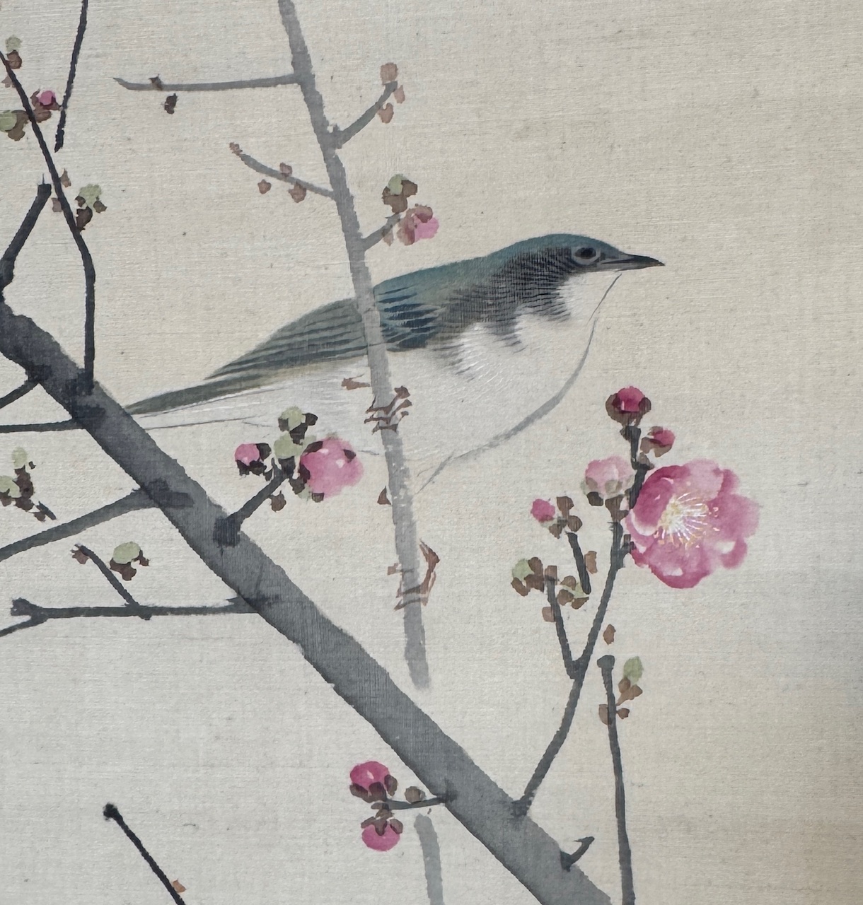 Da ich in all der Zeit insgesamt wenig spezialisiert sammelte – ich trug alles, was ich an Kunst und Malerei schön und interessant fand, zusammen – kann ich es mir jetzt leisten, auszuwählen und themenorientierte Ausstellungen zu machen. Der Jahreszeit entsprechend wählte ich dieses Mal Malereien von Pflaumenblüten und blühendem Sakura mit kleinen singenden Vögeln auf den Ästen als Schwerpunkt aus.